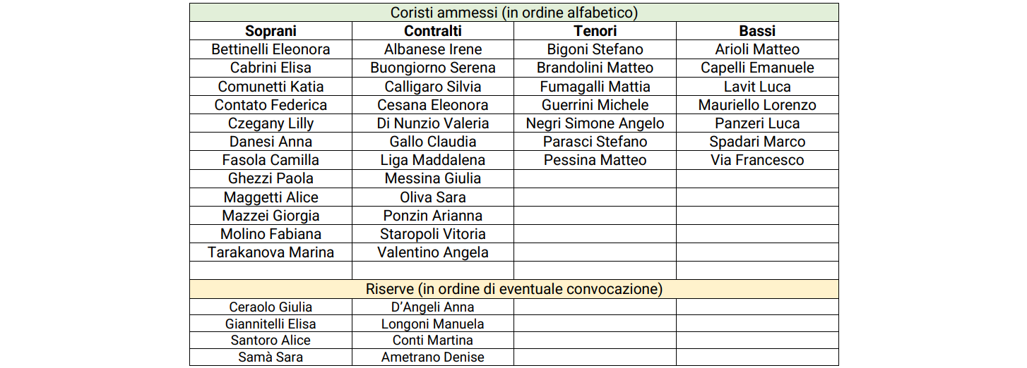 Elenco coristi ammessi e riserve